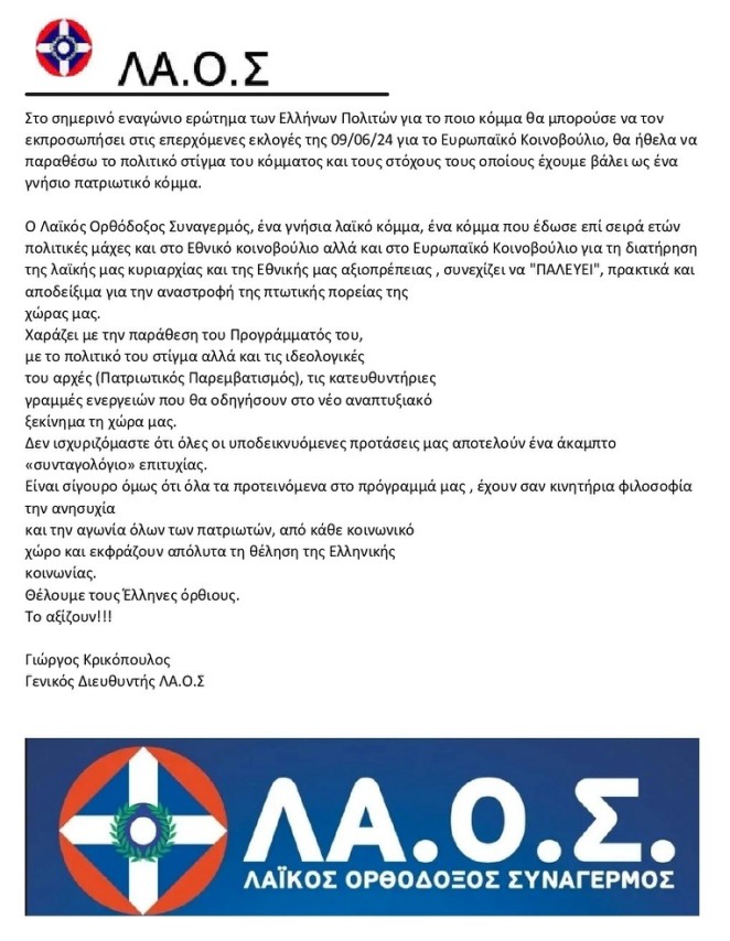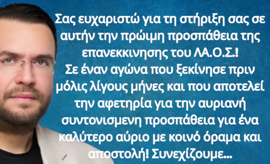 Ως πιστό μέλος – στέλεχος του ΛΑ.Ο.Σ. από το 2009 & ψηφοφόρος του από το 2004, δηλώνω ότι η κληρονομιά που φέρει το κόμμα μας είναι βαριά! Δε θα την αφήσουμε σε καμία περίπτωση εμείς οι λίγοι που μείναμε ενεργοί να τη νέμονται όσοι υφίστανται πολιτικά χάρη στον αγώνα & την ατζέντα του ΛΑΙΚΟΥ ΟΡΘΟΔΟΞΟΥ ΣΥΝΑΓΕΡΜΟΥ! Το κόμμα έχει διάδοχη κατάσταση, με εκλεγμένο από το Δεκέμβριο 2023 πρόεδρο το Φίλιππο Καμπούρη, έρχεται από μακρυά & θα επανέλθει στο πολιτικό προσκήνιο, είτε αυτόνομα είτε στα πλαίσια ενός ευρέος πατριωτικού σχήματος!